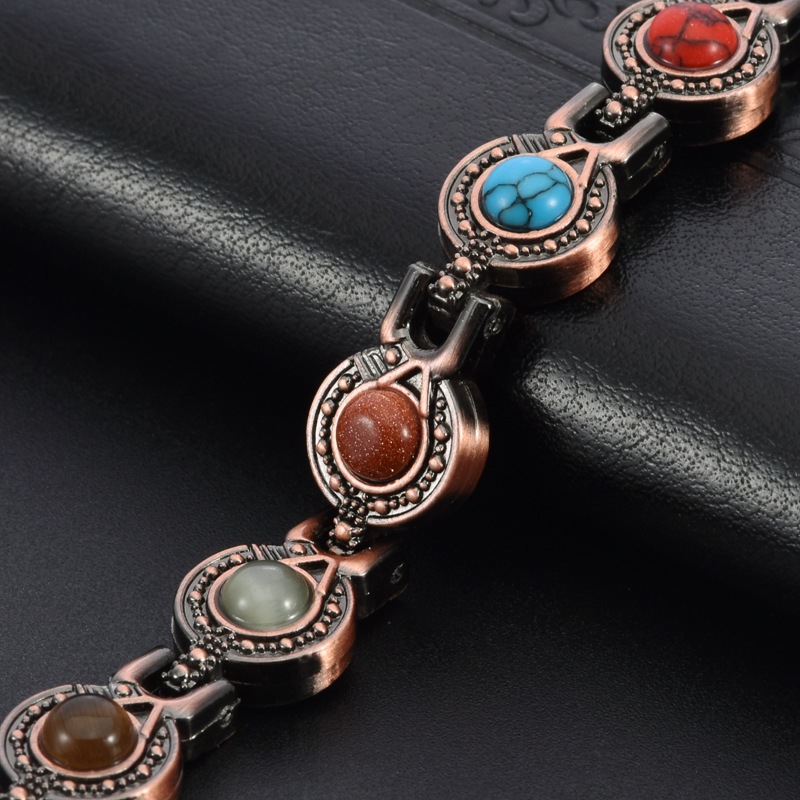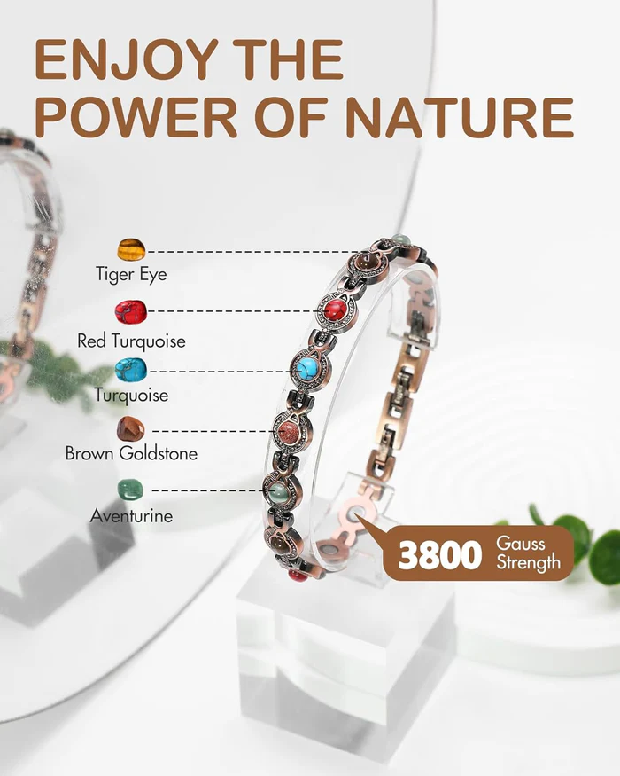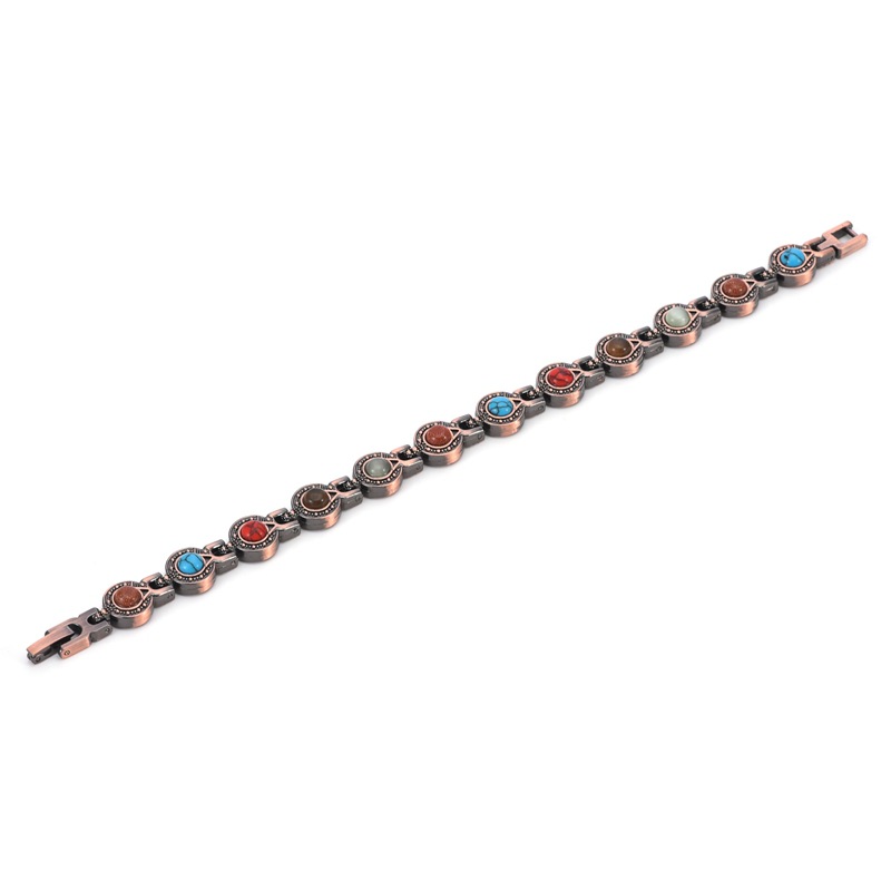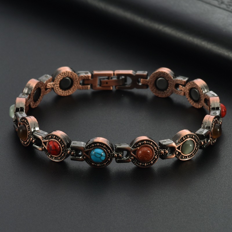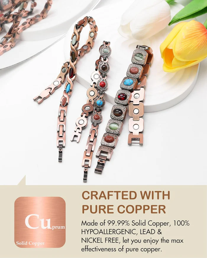 Discover the enduring advantages of magnetic therapy with this chic copper-plated bracelet. Crafted for both men and women, this adjustable, lightweight, and sturdy bracelet merges fashion with wellness.
